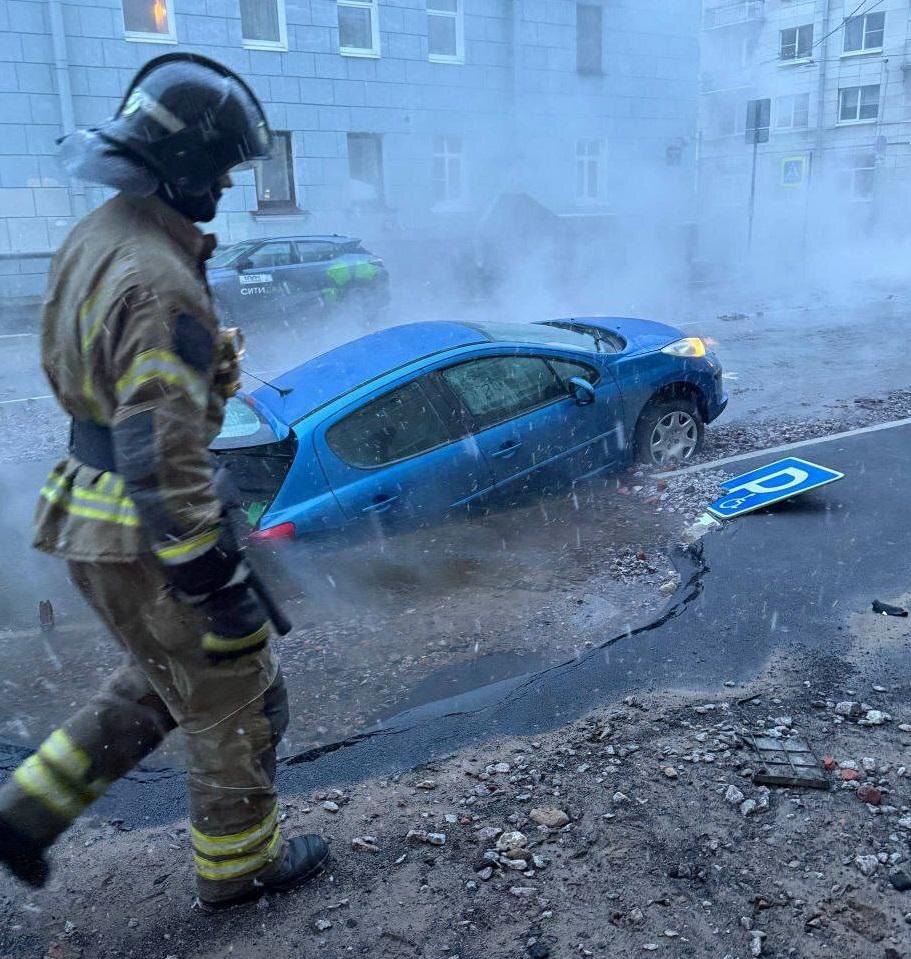 Фото: машина провалилась в яму с водой на месте прорыва на 5-й Советской