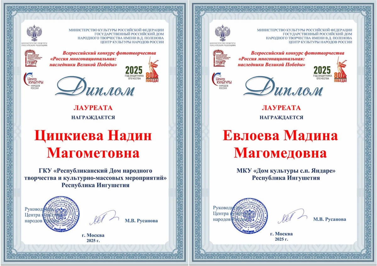 Представительницы Ингушетии стали лауреаты Всероссийского конкурса В России подвели итоги масштабного конкурса фототворчества «Россия многонациональная: наследники Великой Победы», инициированного Центром культуры народов России Государственного Российского Дома народного творчества им. В. Д. Поленова. Конкурс стал яркой площадкой для сохранения исторической памяти и демонстрации культурного многообразия нашей страны через призму фотоискусства. В число лауреатов конкурса вошли талантливые представительницы Ингушетии Надин Цицкиева и Мадина Евлоева. «Первый этап конкурса продемонстрировал впечатляющий охват. Поступило более 200 заявок из 42 регионов России, и было представлено свыше 850 работ. Такой отклик свидетельствует о высоком интересе к теме Великой Победы и о стремлении фотографов из разных уголков нашей страны внести свой вклад в сохранение исторической памяти. Оценка работ проводилась высококвалифицированным жюри, в состав которого вошли А.Н. Колобанов - начальник отдела наци
