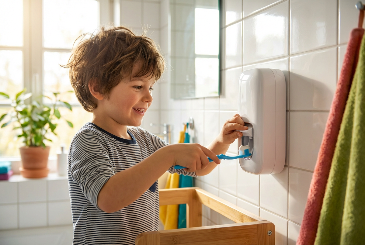 Ребёнок не будет класть свою щётку «куда-то в общую кучу». Ему нужно своё, личное место, которое принадлежит только ему. Это базовая потребность в идентичности. Когда у каждого члена семьи есть свой стаканчик, своя полочка, своё гнездо для щётки — это не просто организация пространства. Это послание: «У тебя есть своё место в этом доме, ты важен».