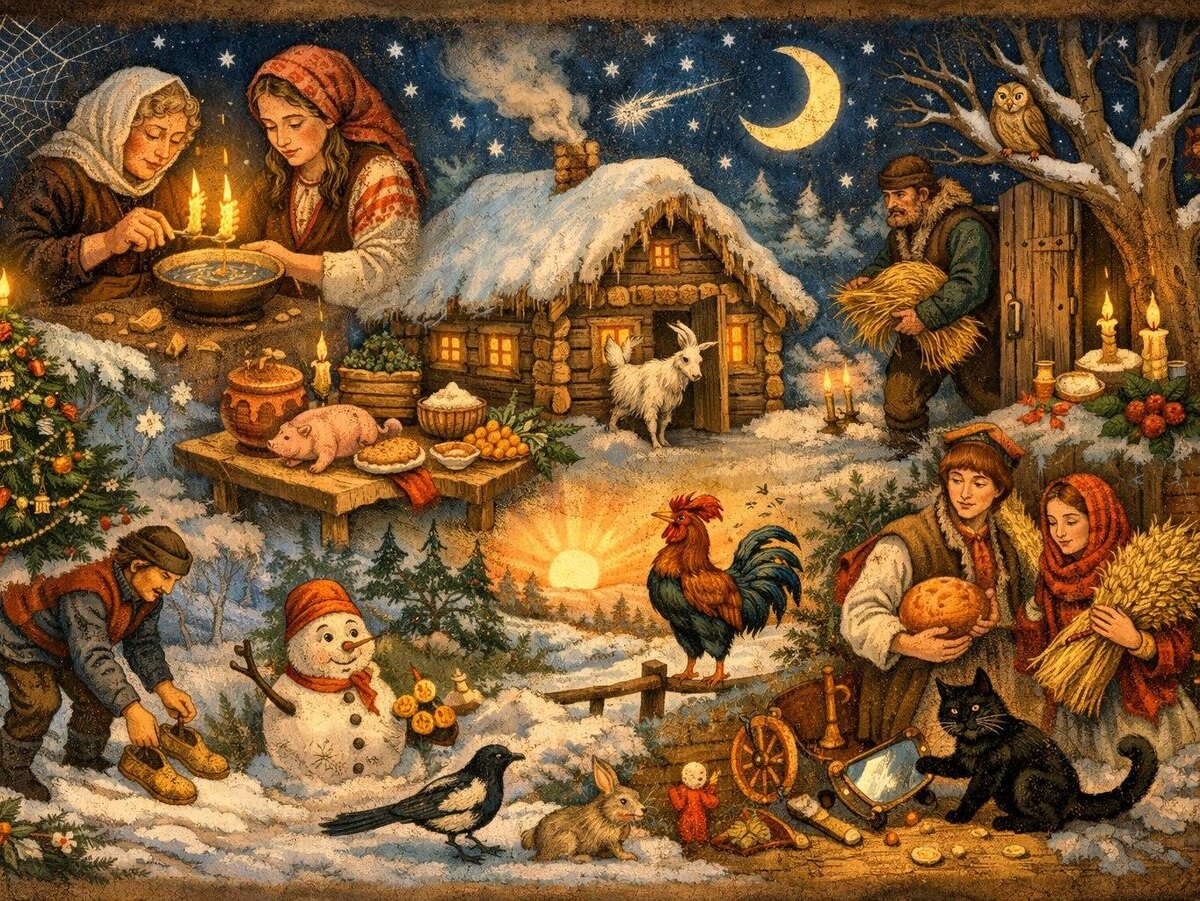В преддверии зимних праздников поделимся с вами мудростью предков. Старорусские поверья, связанные с Рождеством и Новым годом (который в крестьянской среде часто отмечался по старому стилю – в Васильев вечер 13 января), были не просто суевериями, а целой системой мироощущения, тесно связанной с природой, урожаем и благополучием семьи. Время чудес и строгих правил - Святки. Праздничный цикл начинался с Рождества Христова (25 декабря по старому стилю/7 января по новому) и длился до Крещения (6/19 января). Этот период назывался Святками и считался особым, «пограничным» временем, когда грань между мирами истончалась. Именно поэтому так большое значение придавалось как защитным обрядам, так и смелым гаданиям. Главные приметы и запреты: - Богатый стол – сытый год. Подготовка к празднику была ключевой. На Сочельник (канун Рождества) обязательно готовили кутью – кашу из зерна с медом и изюмом. Чем богаче и сытнее был рождественский и новогодний стол, тем более плодородным должен был стать гряд