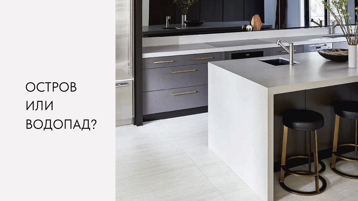 Когда камень красиво «стекает» вниз с поверхности на боковые панели кухня сразу выглядит дороже.