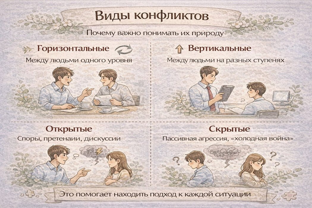 Конфликт — это не всегда «скандал». Чаще это столкновение интересов, позиций или ожиданий. Для того чтобы грамотно справляться с конфликтами, важно понимать, какими они бывают. Один из удобных способов классификации — по направленности и по форме проявления. Это конфликты между людьми, которые занимают примерно одинаковое положение.