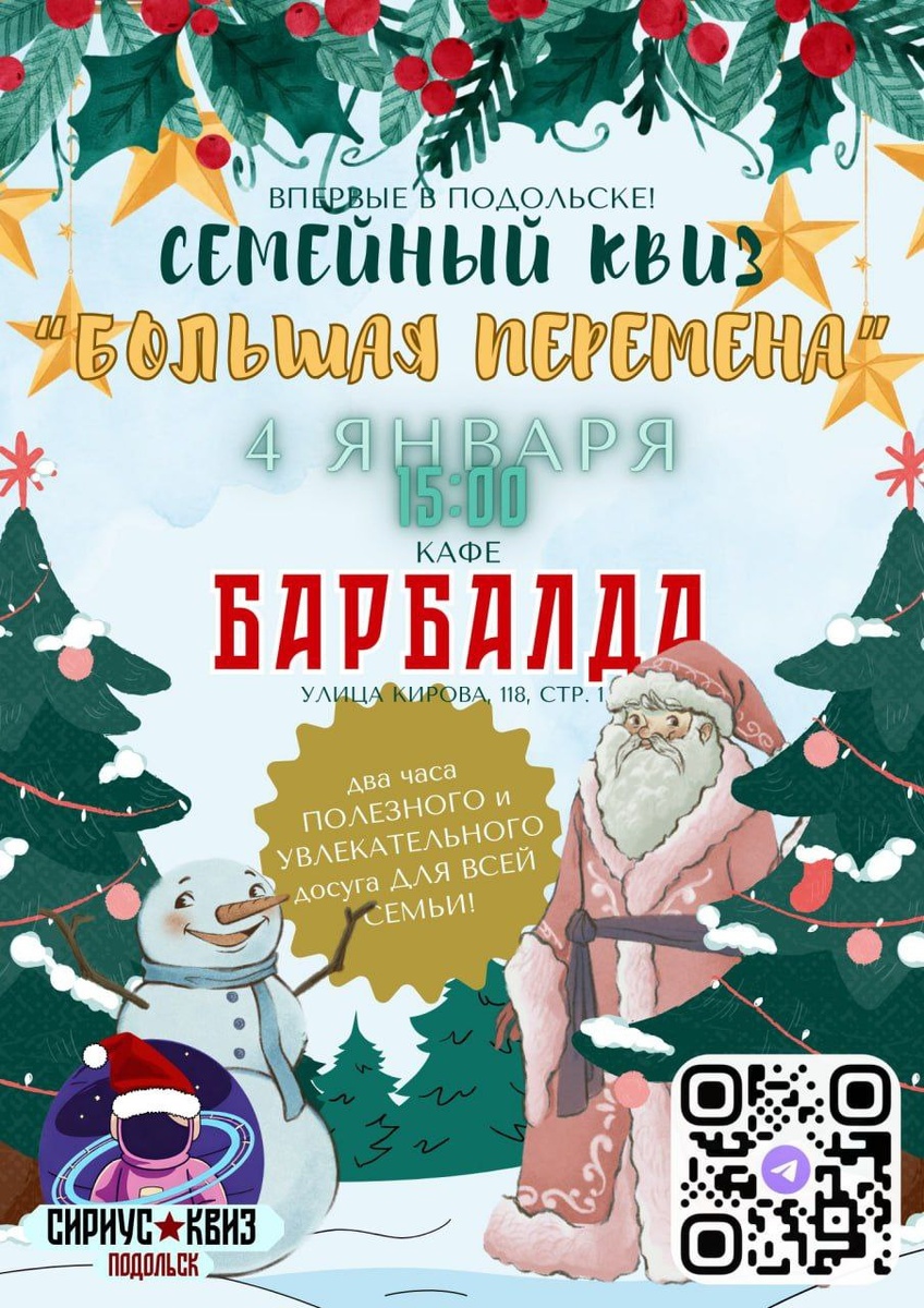 " 🎄 Друзья, приглашаем вас на первый семейный квиз в Подольске! Вы можете отличить Алису Селезнёву от Гермионы, Электроника от Люка Скайуокера, Лунтика от Незнайки, а Мэри Поппинс от Маши Старцевой?! Тогда вам точно на "Большую Перемену"! Отвлекитесь от бесконечных гаджетов, приставок и телевизоров. Соберите семейную команду и проверьте свою эрудицию и интуицию! Вас ждёт 7 туров по 7 вопросов с вопросы про фэнтези и фантастику, музыку и мультфильмы, книги и сериалы! Регистрация участников: 📞 +79850879205 📱 https://t.me/sirius_quiz 🚫 Возраст: 0+ 📆 04.01.2026 🕒 15:00 🏢 Кафе "БарБалда" 📍 г. Подольск, ул. Кирова 118, стр. 1 💰 Цена: Дети (до 16) - 400 ₽ Взрослые - 600 ₽ 🎫 Регистрация по ссылке: https://docs.google.com/forms/d/e/1FAIpQLSeDr-qENzCvxKX8d9G6Tc0OL-QfGTU2R8Eix0UvKXSDojJaYQ/viewform?usp=dialog #пабквиз #квиз #семейныйквиз #БольшаяПеремена #Подольск #Кузнечики #БарБалда ✅ Мероприятия Подольск https://dzen.ru/id/66ed500f7b5671493eca3fd6 http://vk.com/podolsk_ev
