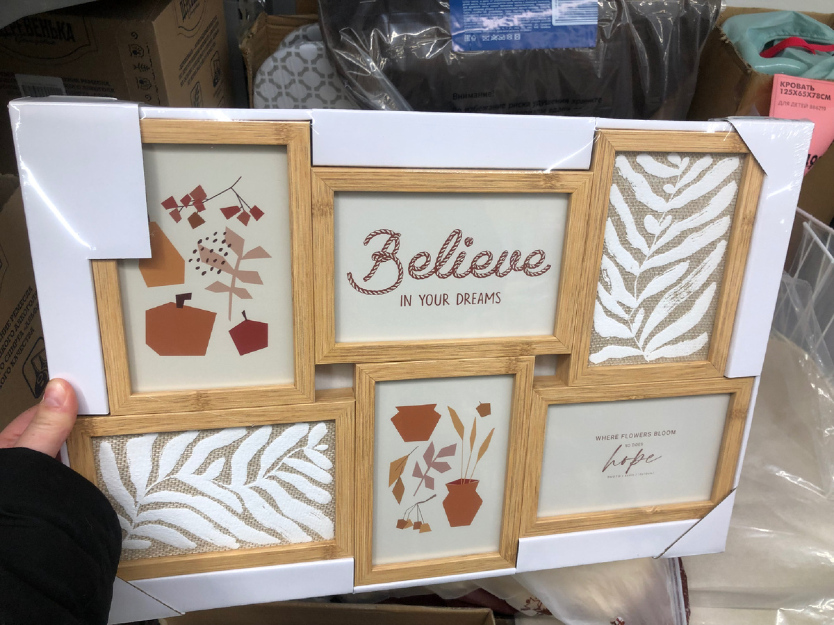 Привезли фоторамки на 6 фотографий размером 10х15 см. Размер 44,4х30,5х2 см. Очень классные! Долго не пролежат точно. Разберут быстро. Цена 899 рублей.
