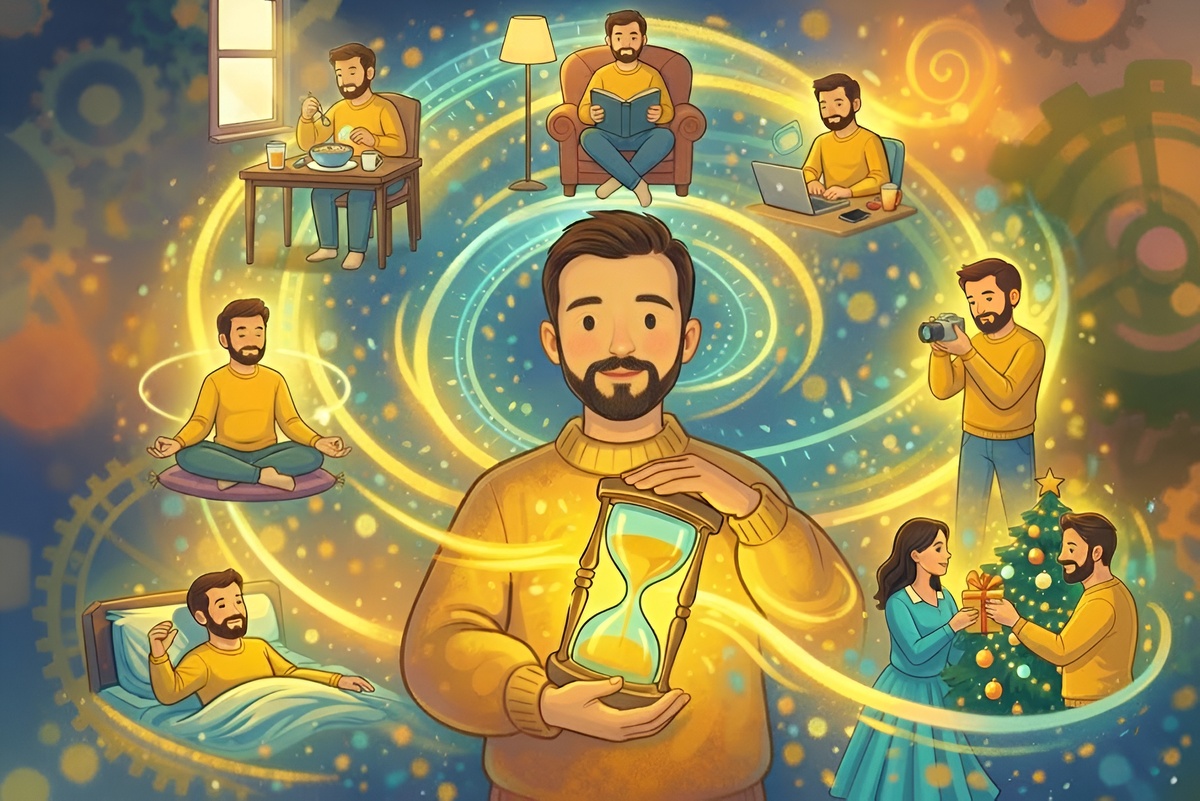 Адвент 2025【2️⃣0️⃣】 Сегодня я хочу поделиться с вами, пожалуй, одним из самых важных темпоральных ритуалов в моей жизни. Кажется, ещё в детстве его мне передал папа, но, наверняка я помню и понимаю его по-своему. Ритуал очень простой: 31 декабря до того, как часы пробьют двенадцать, нужно понемногу, хотя бы по несколько минут, поделать всё то, что ты очень любишь и хочешь продолжать делать весь следующий год. Это точно не про «доделать долги» и напихать ещё больше дел в авральный конец месяца. Это про демонстрацию самому себе красоты и удовольствия, которые прячутся в самых обычных, но любимых делах. ⋯⋯⋯ 🕰 Машина времени на один день Прошлое: ты вспоминаешь, что наполняло твой уходящий год смыслом и радостью. Не по спискам и достижениям, а по ощущениям. Настоящее: ты ритуально, в сжатой «демо-версии», воспроизводишь эти действия здесь и сейчас, чтобы поймать и запечатлеть в памяти особое состояние. Будущее: ты буквально проектируешь свой следующий год. Как встретишь — так и проведёшь