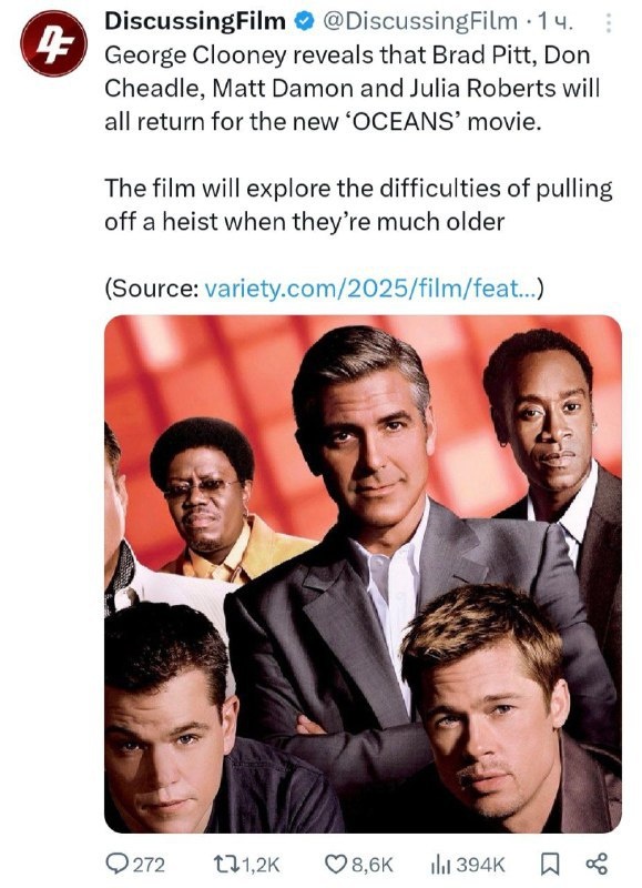 Брэд Питт, Мэтт Дэймон, Джулия Робертс и Дон Чидл вернутся к своим персонажам, вдохновленные концепцией истории о пожилых воришках; всем им сейчас от 55 до 64 лет. Режиссером станет Дэвид Литч, известный по фильмам о Джоне Уике и второму Дэдпулу. — В нас что, стреляют? — Нет, это мои колени. Постмейкер - автоматическое ведение канала 🤖 Анимация | СhatGPT-4 | Помощь с резюме