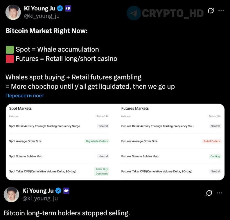 🐃 CEO CryptoQuant: Киты сейчас накапливают BTC (спот), долгосрочные холдеры прекратили распродажу Биткоина, в то время как фьючерсный рынок