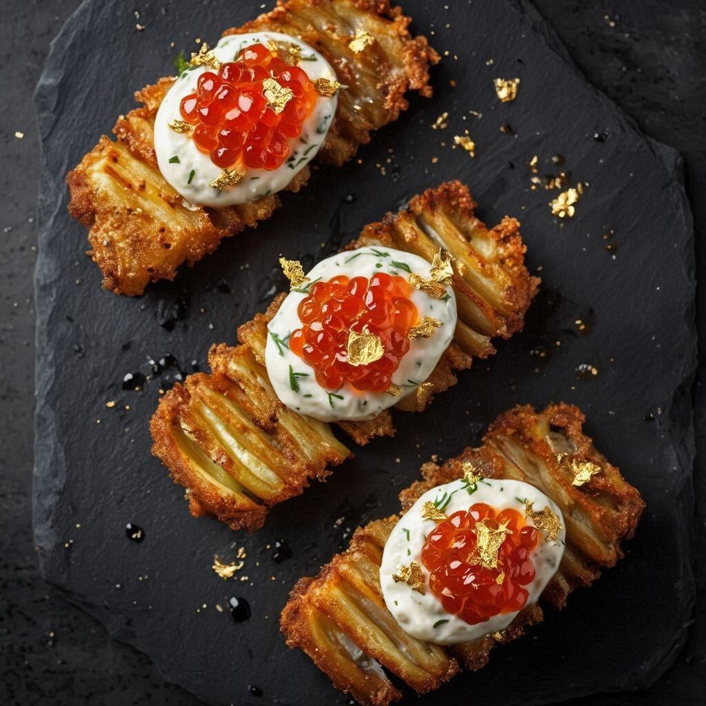 1. 🥔 Картофельные рёбрышки с крем-фреш, красной икрой и золотом
