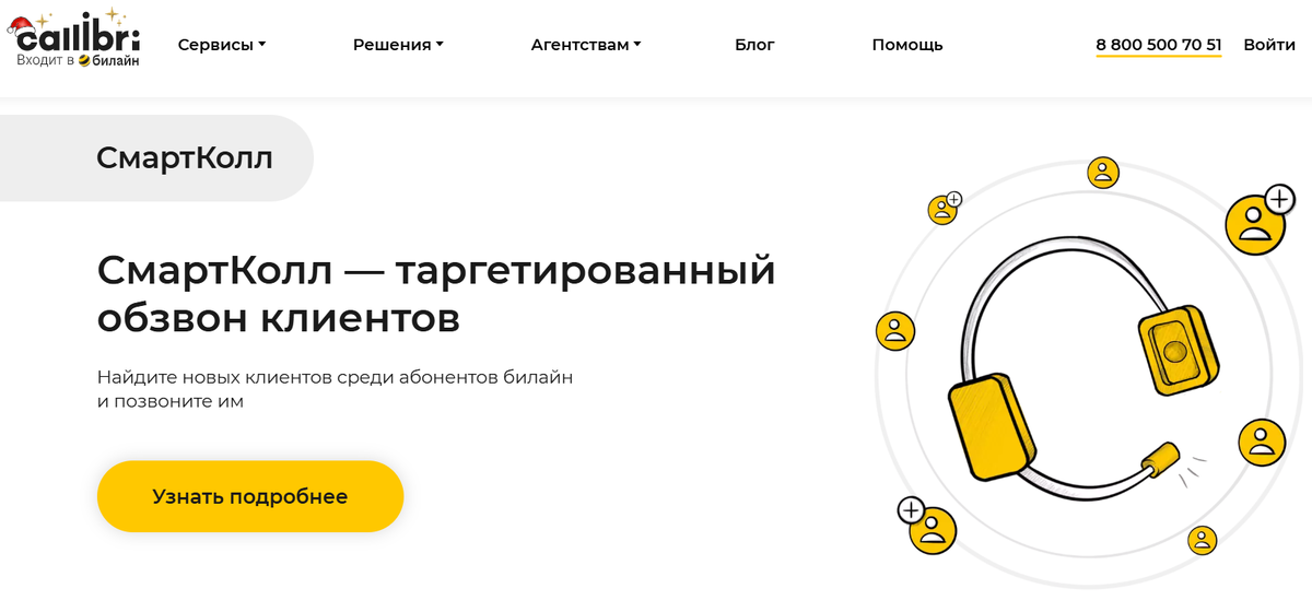 Сервис предлагает функцию таргетированного обзвона по базе абонентов Билайн через партнёрскую программу. Сервис подходит e-commerce, банкам и страховым компаниям, которым нужен прямой контакт с тёплыми клиентами. Стоимость обсуждается индивидуально.