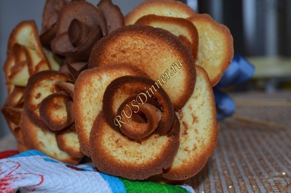 » От автора: Печенье «Розочки» совмещают в себе красоту и очарование, довольно не обычная подача вкусного печенья. Ингредиенты: Яйцо - 2 шт. Сахар - 90 гр. (0,5 ст.) Сахар ванильный - 5 гр. (или щепотку ванилина) Мука - 65 гр. (0,5 ст.) Какао порошок - 15 гр. Масло сливочное - 60 гр. Источник: https://rusdinner.ru/page/pechene-rozochki