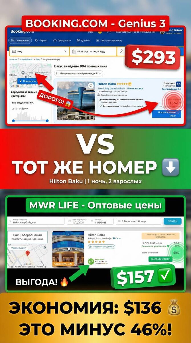 Готова была бронировать, но вспомнила совет подруги: «Проверь Travel Advantage, там иногда дикая разница». Открыла со скепсисом. Увидела то же самое: Hilton Baku, те же даты, тот же номер. Но цена... $157. Я перезагрузила страницу. Проверила условия. Убедилась, что это не «ловушка». Разница составляла $136 — почти половина стоимости! Сделала скриншот, чтобы сохранить доказательство. Вот что увидела: Booking = ритейл для путешественников: Travel Advantage (MWR Life) = оптовые контракты: Проще говоря: на Booking вы платите за «экосистему бронирования». На альтернативных платформах — только за номер. ✅ Booking стал навигатором, а не кассой