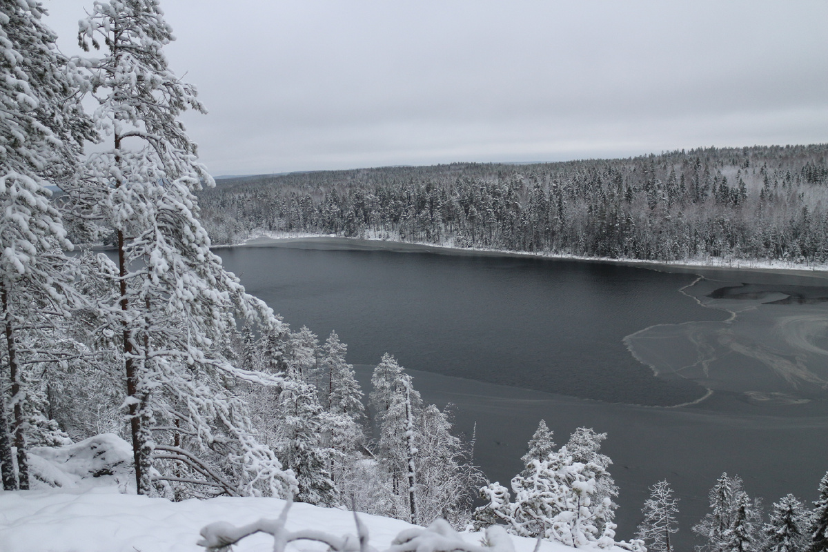 С самой высокой скалы видно, как за озерами в глубине лесных далей, на открытых пространствах - болотах и полянах, ветер поднимает клубы снежной пыли. Не иначе как Лумикки, дочь месяца ясного да тучи снежной, порядки наводит, украшает деревья серебром. Зрелище завораживающее, но ветер гуляет и здесь, на высоте. От его порывов становится жутковато, близко к краю лучше не подходить.