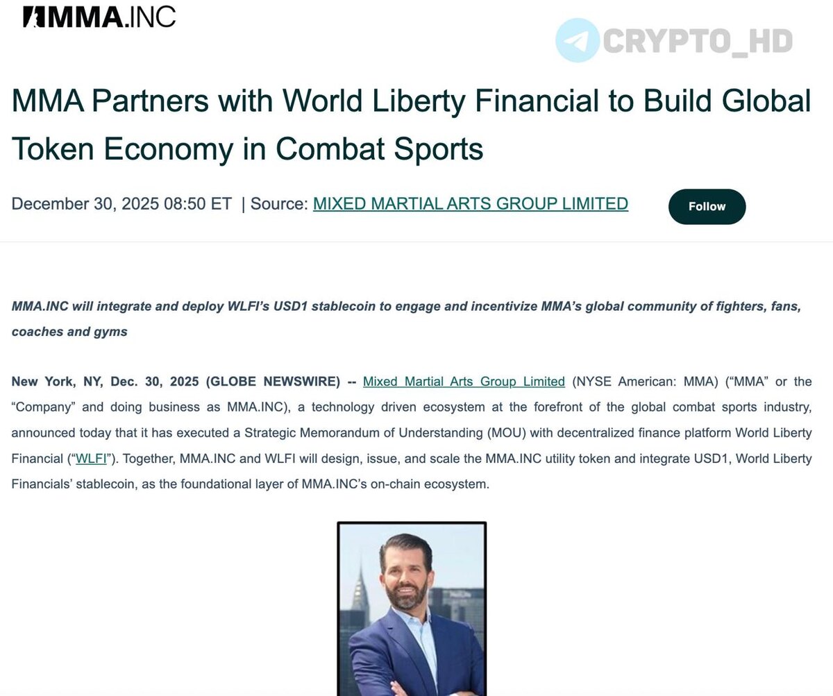 В Mixed Martial Arts Group собираются интегрировать блокчейн-технологии с помощью компании семьи Трампа. ➤ Цель: построить настоящую крипто-экономику для всего комьюнити боевых искусств. ➤ Планы: запуск токена MMA․INC, стейблкоин #USD1 станет основой всей экосистемы, криптовалюту смогут использовать бойцы, фанаты, тренеры и спортзалы по всему миру. ➤ Фишка проекта: тренируешься, смотришь контент, активничаешь в комьюнити – получаешь очки опыта (XP), которые можно обменять на реальные награды/токены. ➤ У MMA Group: 5m подписчиков в социальных сетях, 75k учеников в спортивных залах по всему миру. Crypto Headlines
