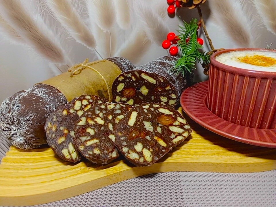 Шоколадная колбаска с грецким орехом и вяленой клубникой.