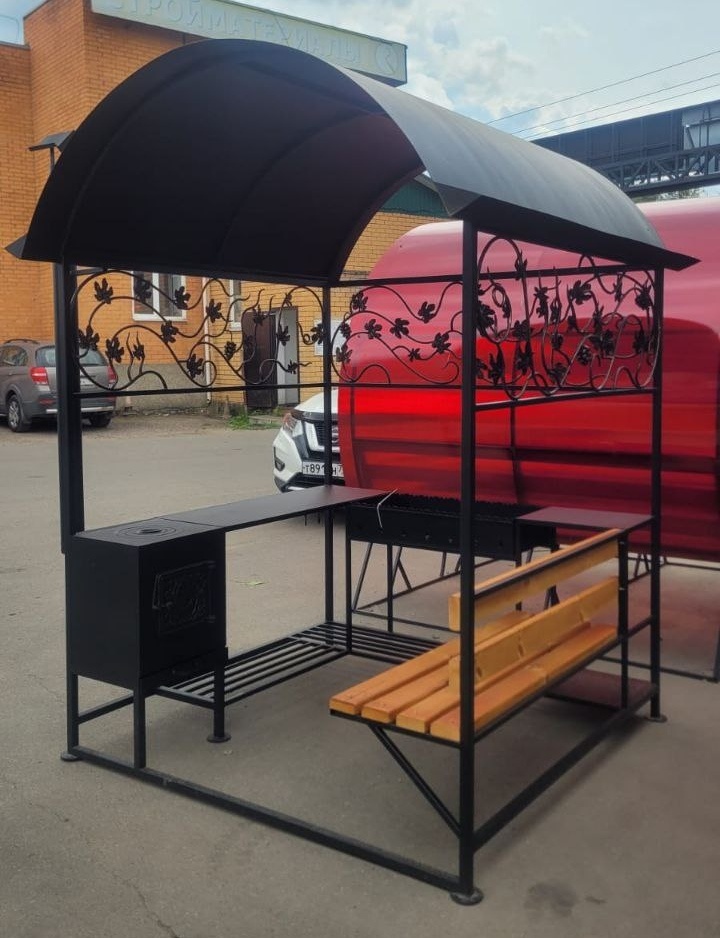 Навес мы заказали без начинки. После установки на место муж сам сварит всё необходимое содержимое по своему вкусу. А печка у нас уже и так имеется. Просто пока на улице стоит.