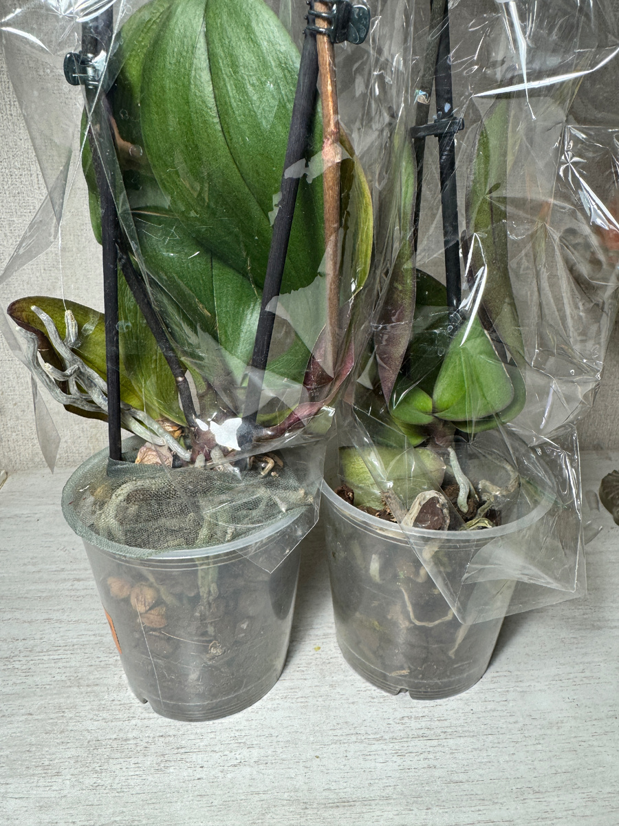 Обе орхидеи в печальном состоянии, у первой почти нет корней. Вторая получше, корней больше, поэтому я решила один из цветоносов ей оставить.