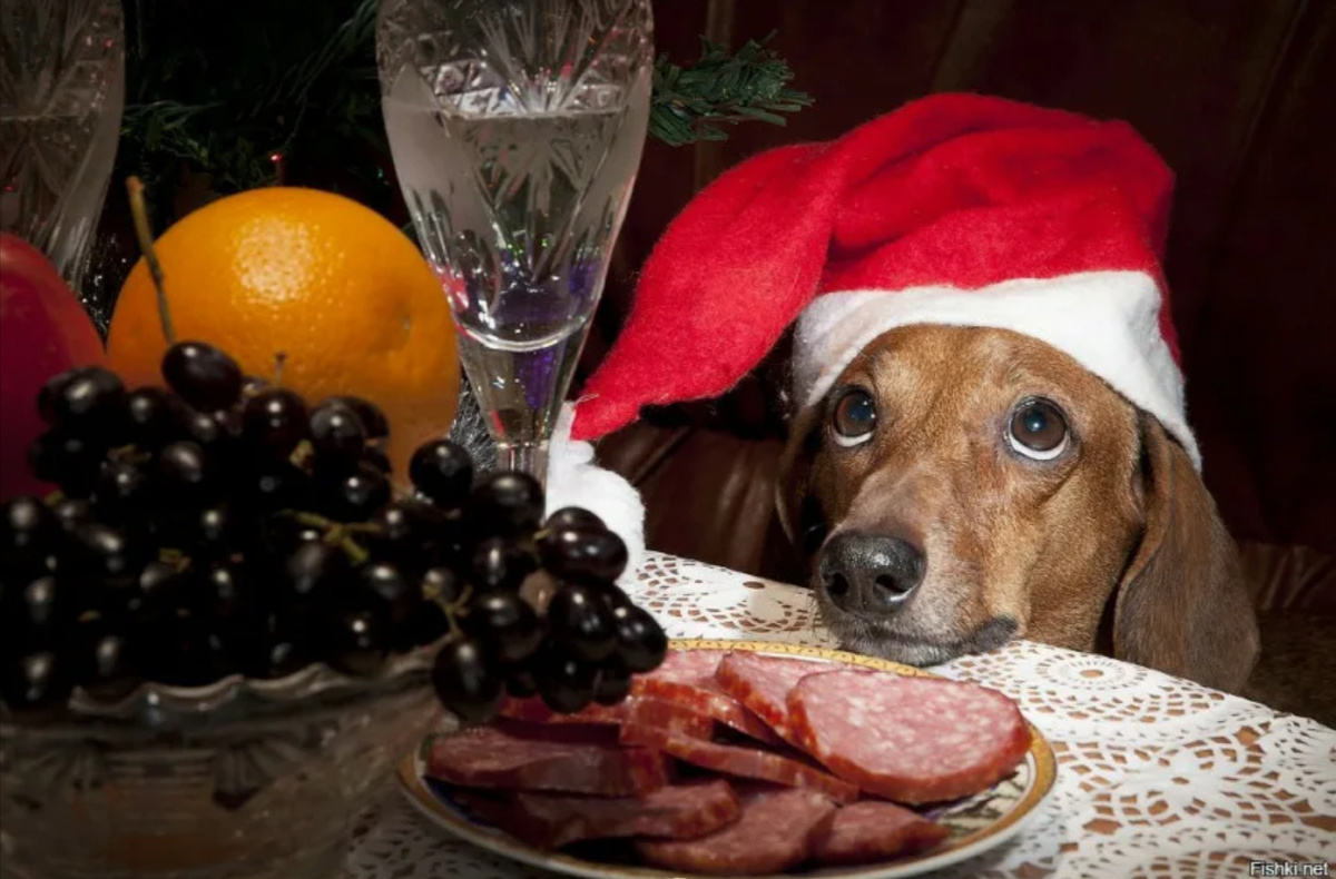 Какой Новый год без праздничного застолья? Оливье, селедка под шубой, рулетики с начинкой, торт, лимонад, алкоголь, канапе, запеченный гусь. Вам весело, гости вкушают блюда и незаметно для вас угощают питомцев. Кто-то дал собаке жареную курицу, кошку угостили колбаской, попугаю кинули торт, а с кроликом поделились фруктами.