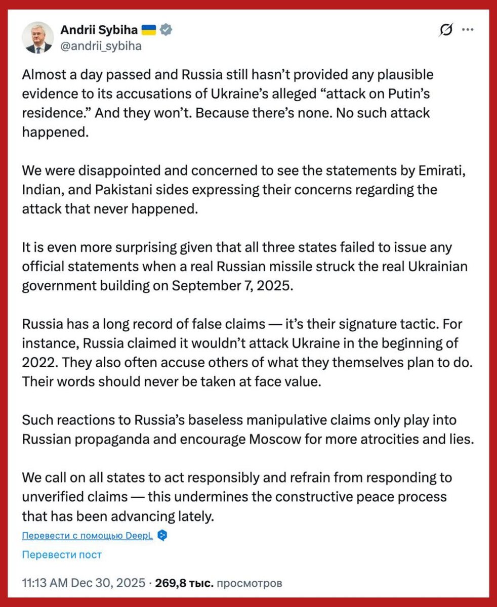 Глава МИД режима Зеленского раскритиковал заявления ОАЭ, Индии и Пакистана с осуждением атаки на резиденцию Путина, о которой заявила РФ, но