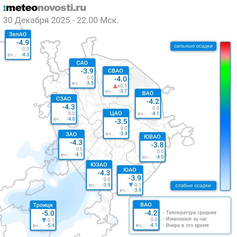 В 22:00 в Москве было от -5.3°C до -3.1°C, средняя температура -4.1°C #погода #Москва #зима #температура #30декабря #вторник