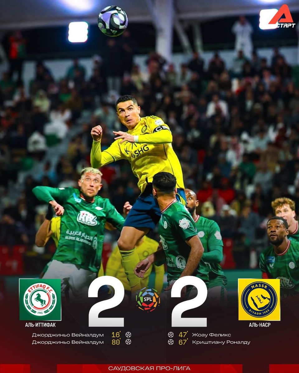 ! Но Вейналдум отобрал у его команды победу. Первый тайм парни Жорже Жезуша проиграли «Аль-Иттифаку», но во втором Жоау Феликс и Роналду вывели «Аль-Наср» вперед. Однако последнее слово Джорджиньо оставил за собой – 2:2. Криш пробьет тысячу в 2026-м? 😏 Подписывайся на ТВ СТАРТ в MAX📲