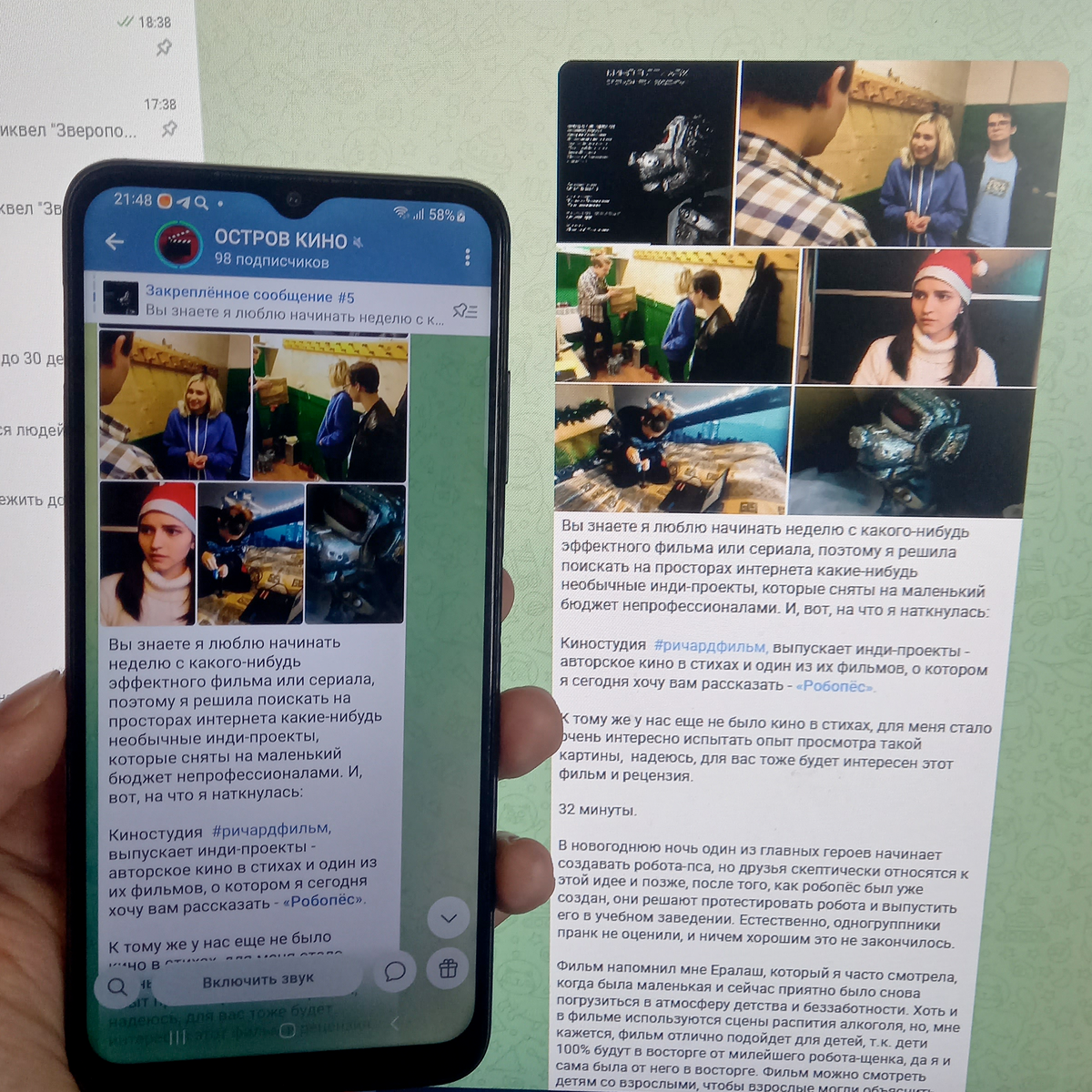 Небольшой телеграм-канал “ОСТРОВ КИНО”, публикующий обзоры на редкие фильмы, в том числе и инди-проекты, опубликовал рецензию на нашу короткометражку. Буквально 29 декабря. История робота, нюхающего запахи, и его изобретателя Гоши, которого сыграл Владислав Горбачев, понравилась администрации канала. А нам было приятно, что они её разобрали.