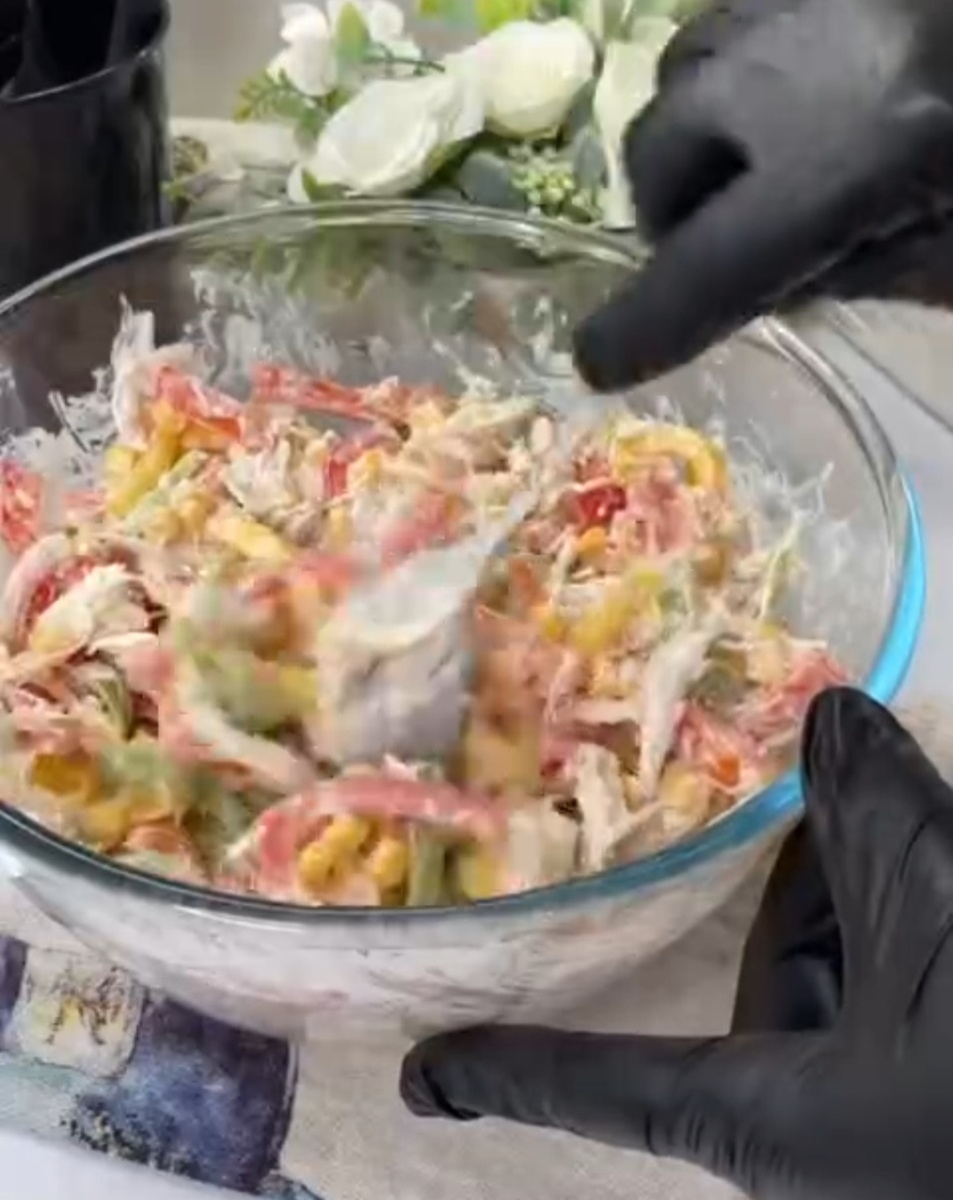 Шаг 5. На данном этапе собираем все компоненты воедино. Выкладываем в глубокую ёмкость порезанные овощи, кусочки курицы и кукурузу. Осторожно смешиваем содержимое ложкой, следя за тем, чтобы всё равномерно распределилась.