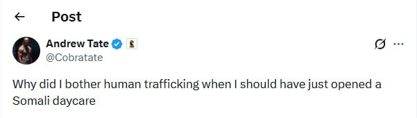 Andrew Tate realizes he's been out-hustled by Somali daycare owners