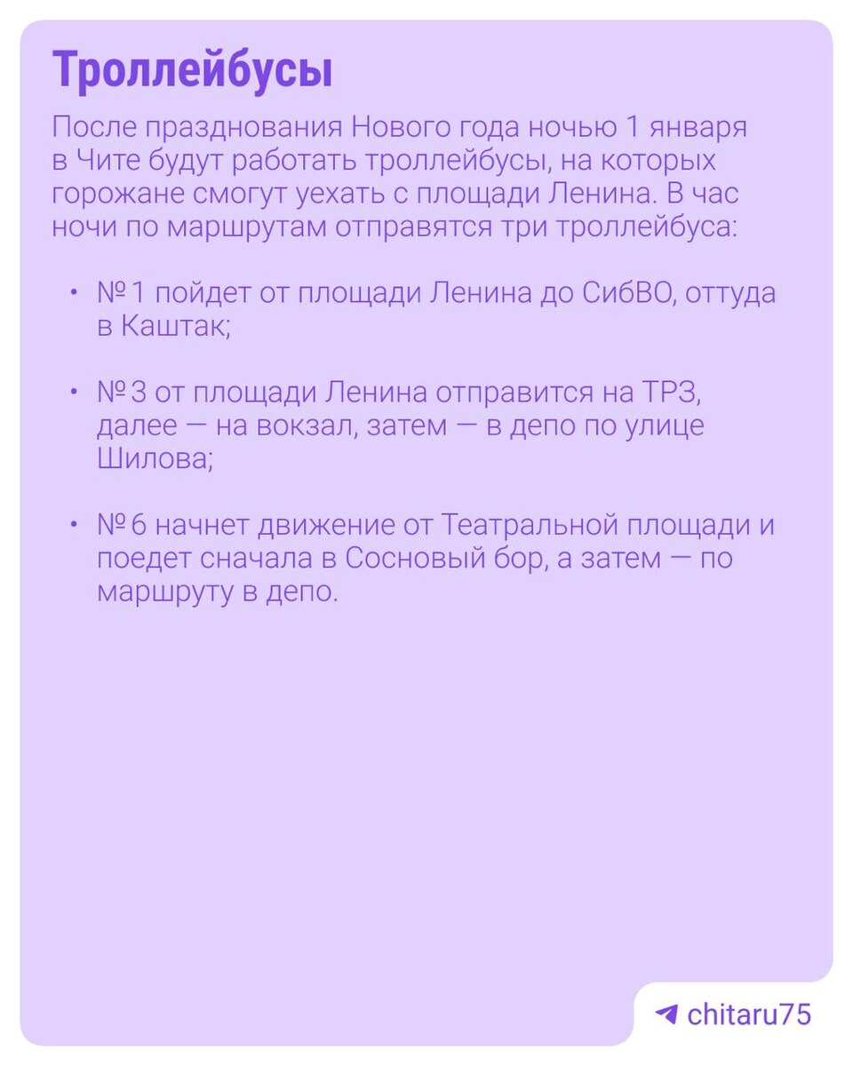 Сегодня троллейбусы в Чите будут работать в обычном режиме, а после празднования Нового года даже развезут всех по домам.