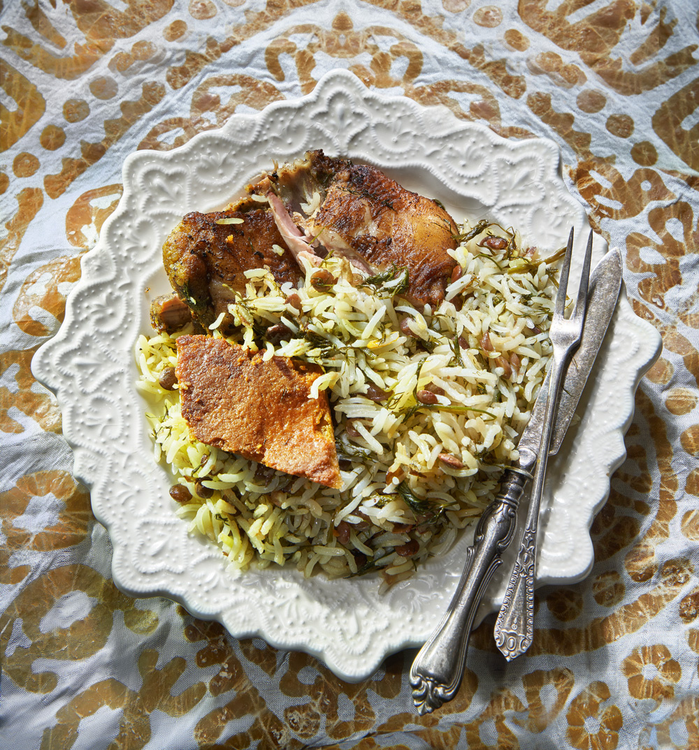 Мясо замаринуйте со специями и подсолнечным маслом на четыре-пять часов. Разотрите шафран с солью, заварите небольшим количеством кипятка. Рис и отдельно чечевицу замочите в холодной подсоленной воде. Через час слейте воду, залейте кипятком, отварите до полуготовности, промойте холодной водой. Укроп нарежьте не слишком мелко. Отложите 200 г риса для газмаха. Оставшийся рис, чечевицу и укроп смешайте. Мясо целиком (или большими кусками) обжарьте на сильном огне. Замешайте газмах, выложите на дно кастрюли, на него – половину риса с чечевицей. Сверху – мясо и еще слой риса с чечевицей. Полейте топленым маслом и шафрановым настоем. Поставьте в закрытом казане на маленький огонь на три-четыре часа.