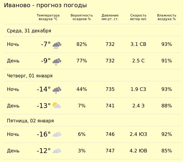 Погода в Иваново на 3 дня, с 31 декабря 2025 года