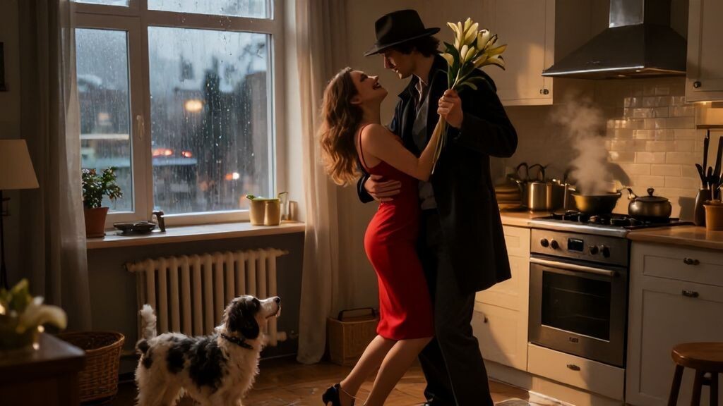 Дверь открыта? Я замер, кофе остывал в руках. На видео мужчина вошел – высокий, в темном пальто, с букетом лилий в руках. Лицо его скрывала тень шляпы, но осанка была знакомой, как укол в сердце. Анна обняла его, прижалась щекой к щеке. Бублик тявкнул, но они не обратили внимания. Музыка заиграла из её телефона – "Танец под дождем". Наша песня. Они закружились по кухне, её руки на его плечах, его ладони на её талии. Свет лампы над столом отбрасывал золотистые блики на их лица. Она смеялась, запрокидывая голову, он что-то шептал ей на ухо. Их шаги синхронны, как в те вечера, когда мы танцевали вдвоем. Дождь за окном усилился, барабаня в такт мелодии.