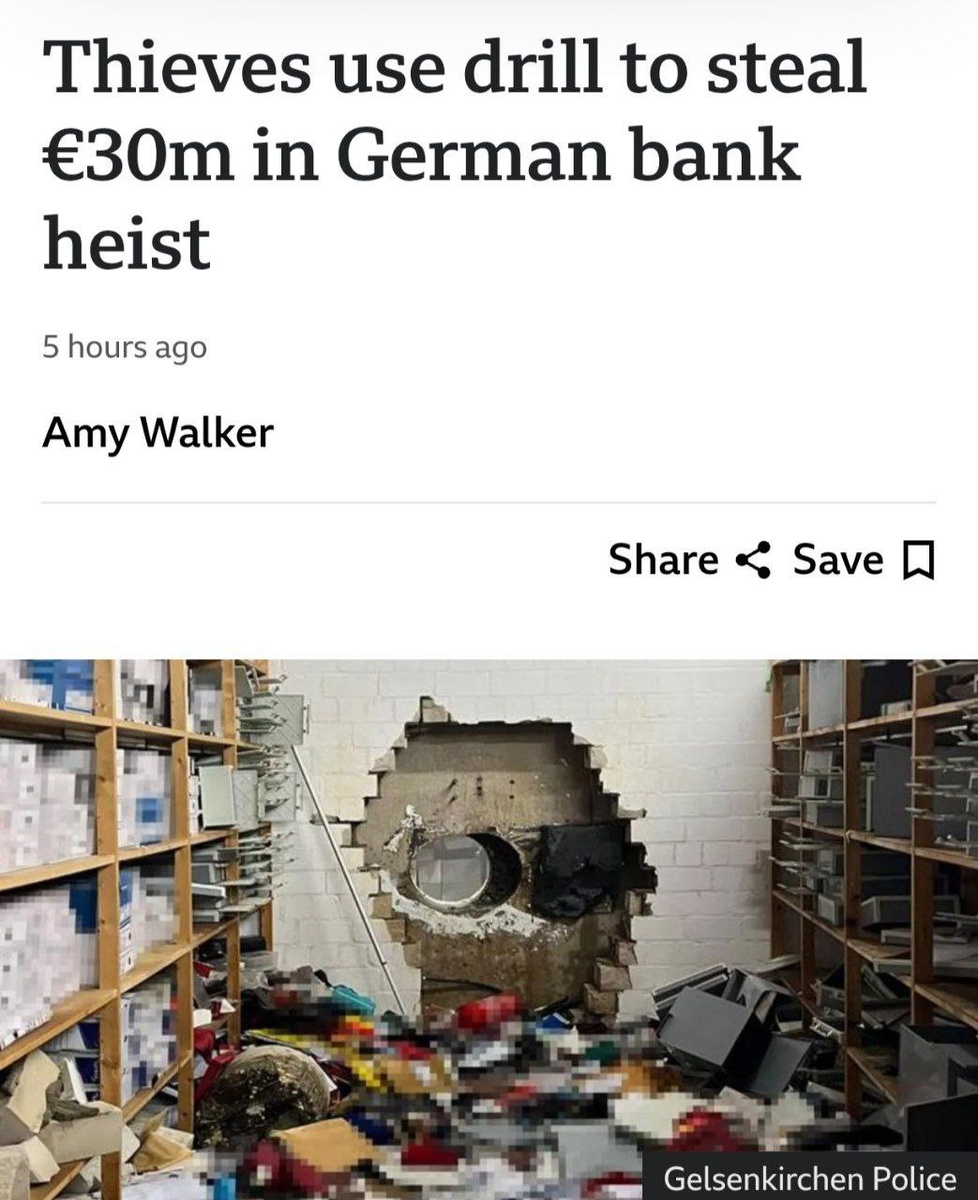 Грабители исполнили все в духе «Одиннадцати друзей Оушена»: пока вся страна праздновала Рождество, они пробрались в соседнее здание, собрали там промышленную дрель и буквально прорубили окно в хранилище. Что в итоге: вскрыто 3200 сейфов, пострадали 2700 клиентов, а сумма ущерба подбирается к 90 млн евро. Грабители обчистили почти все ячейки — унесли буквально все, что можно было. Полиция в шоке, преступники практически не оставили следов. Netflix, забирайте готовый сценарий😏 @Posmotrety
