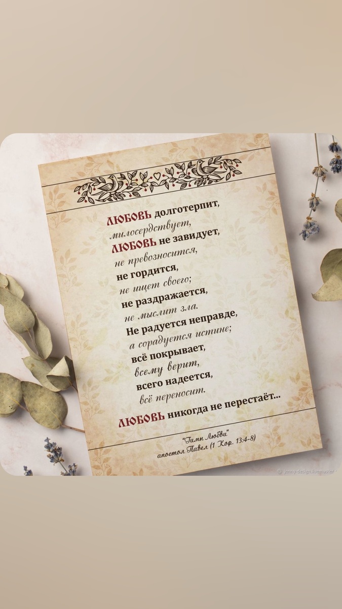 (приведены цитаты из 1 Послания апостола Павла Коринфянам, 13.4-8).