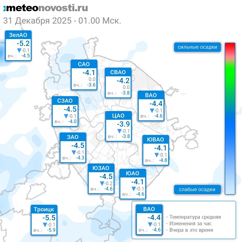 В 1:00 в Москве было от -5.7°C до -3.5°C, средняя температура -4.4°C #погода #Москва #зима #температура #31декабря #среда