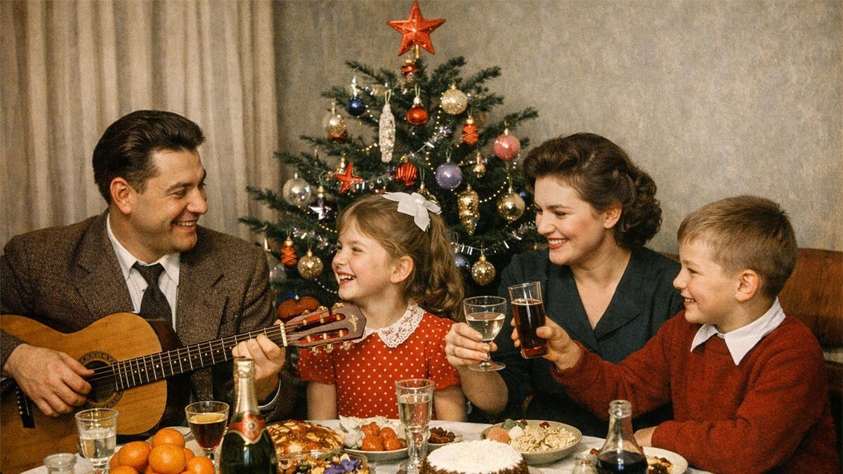 Теплый праздник советских квартир. Новый год в советской квартире редко был событием напоказ. Его не стремились превратить в демонстрацию достатка или внешнего блеска — праздник жил внутри дома, в тесном кругу семьи, среди привычных вещей и узнаваемых ритуалов. К вечеру 31 декабря в комнатах уже стояла елка. Чаще всего живая, с запахом хвои, установленная в металлическую подставку или обычное ведро с песком. Игрушки доставали из коробок, хранившихся годами: стеклянные шары, фигурки космонавтов, сказочные персонажи, шишки, сосульки. Многие из них были старше детей, которые их развешивали. Гирлянды мигали неровным светом, иногда нагревались и пахли пластиком, а на верхушке почти неизменно сияла красная звезда. Праздничный стол накрывали без излишеств, но с особым чувством. Оливье, селедка под шубой, холодец, нарезка, домашние соленья — блюда, которые готовили не ради эффектной подачи, а ради вкуса и традиций. Мандарины и шоколадные конфеты казались настоящей роскошью и ассоциировались ис