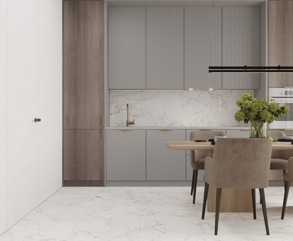 Кухня — одно из самых нагруженных помещений в доме. Здесь постоянно воздействуют влага, перепады температуры, жир, бытовая химия и механические нагрузки. Поэтому выбор керамической плитки для кухни должен быть особенно продуманным. При этом требования к плитке для пола и кухонного фартука отличаются, и учитывать это важно ещё на этапе планирования ремонта. Напольная плитка должна быть прежде всего практичной и износостойкой. Для кухни рекомендуется выбирать плитку с повышенной прочностью и устойчивостью к истиранию, так как пол подвергается постоянной нагрузке. Важно обратить внимание на класс износостойкости и противоскользящие свойства поверхности. Лучше всего для пола подходят матовые или слегка текстурированные поверхности — они менее скользкие и скрывают мелкие загрязнения. Глянцевая плитка выглядит эффектно, но на ней заметнее пятна и следы от воды. Размер плитки подбирается с учётом площади кухни: в небольших помещениях гармонично смотрятся средние форматы, а в просторных кухня