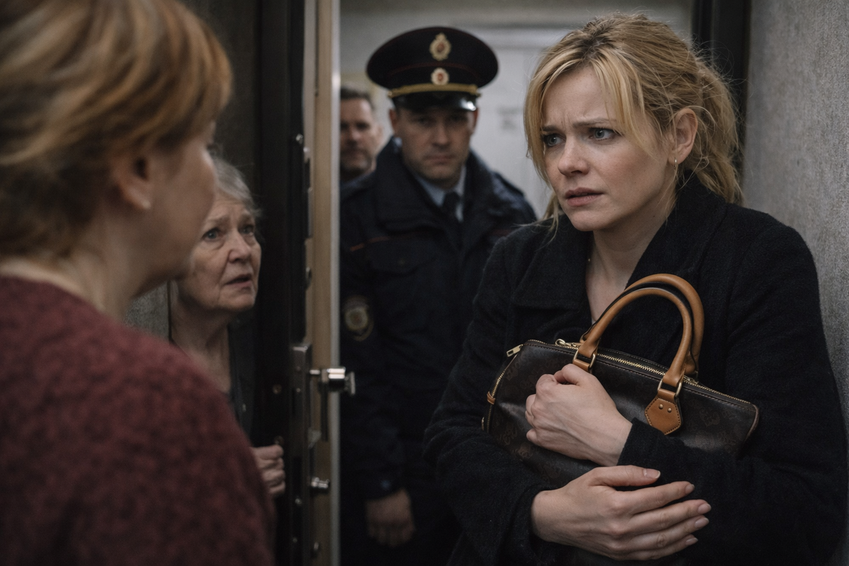 В подъезде горела тусклая лампа. Под ней стояла женщина в тёмном пальто, с мокрыми от снега волосами. Она держала в руке дорогую сумку — такую, какие носят женщины из сериалов: жёсткая кожа, ровные швы, блестящая фурнитура, как у банкетной жизни.