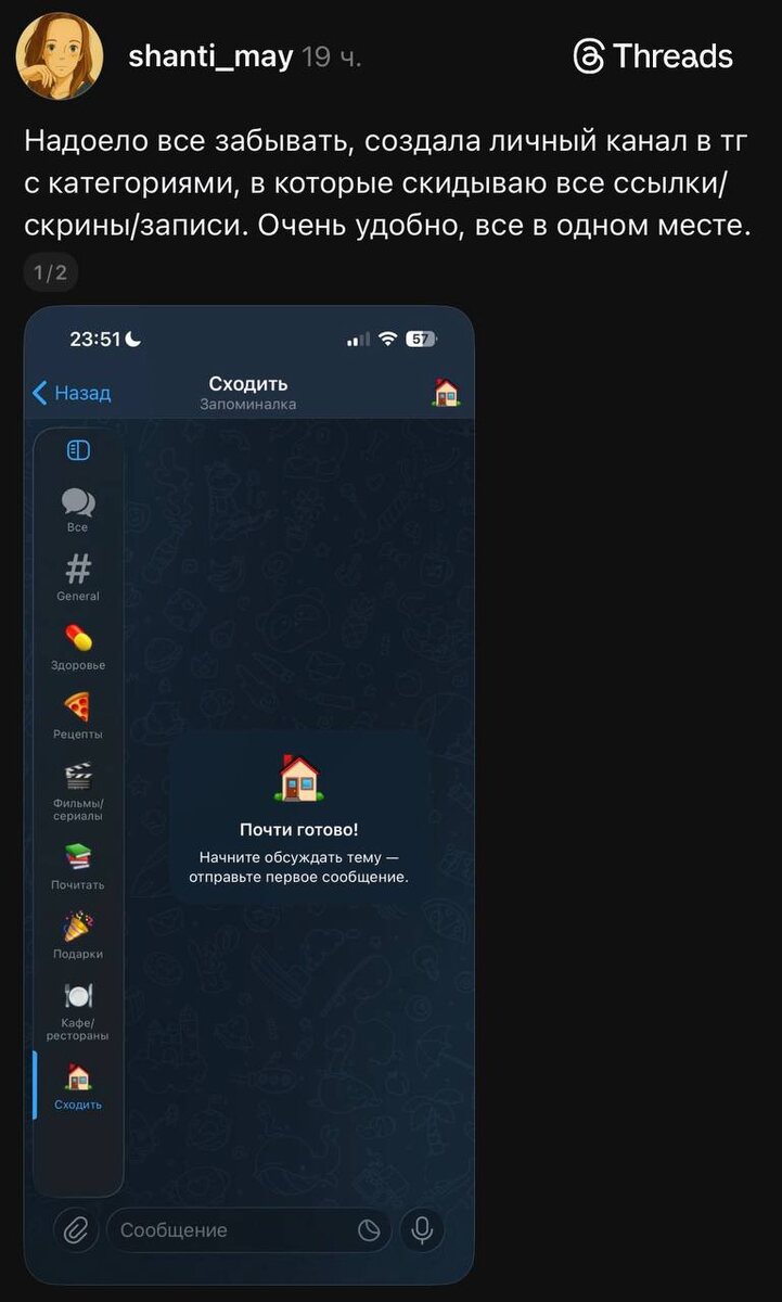 Делается приватный чат с включёнными темами, где каждая тема — отдельная категория: рецепты, фильмы, вишлисты, задачи, лекарства, места и всё остальное. Механика элементарная: создаёте группу 🔴 заходите в настройки 🔴 ставите тип «Частная» 🔴 включаете «Темы» 🔴 создаёте нужные разделы. По сути, это личные «Заметки», но с удобным поиском по словам. Бонус — можно добавить семью или друзей и вести общий список дел. CtrlAltDelights- подписаться