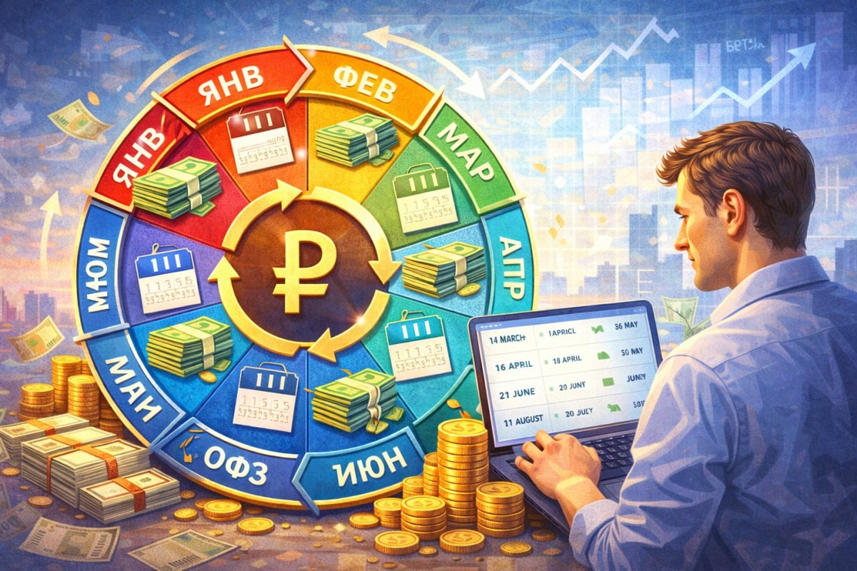 🔄 Главная боль начинающих — выплаты не каждый месяц. В феврале есть, в марте пусто 😤. Для этого и существует стратегия «Колесо». 🧱 Основа — облигации. Например, 6 ОФЗ, каждая платит два раза в год, но в разные месяцы. В итоге деньги капают ежемесячно. 📅 Расписание выплат известно заранее. Его легко посмотреть и собрать портфель так, чтобы каждый месяц были поступления. 🏢 Если каких-то месяцев не хватает — добавляются корпоративные облигации с выплатами 4 или 12 раз в год. Главное — высокий рейтинг, а не погоня за 30%. 🌍 Для защиты от девальвации можно добавить валютные облигации 💱, если позволяет сумма. 📌 Итог: даже с 5 000 ₽ вы собираете портфель, который платит каждый месяц и мотивирует идти дальше 🚀. не ИИР