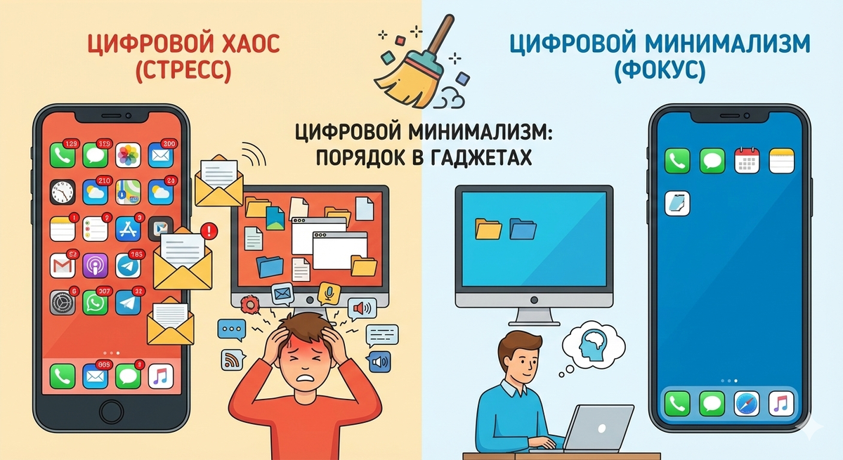 Мы привыкли прибираться дома, но редко наводим порядок там, где проводим до 8 часов в день — в наших смартфонах и компьютерах. Цифровой хаос — это невидимый вор энергии. Сотни иконок на рабочем столе, тысячи непрочитанных писем и бесконечные уведомления заставляют мозг работать в режиме постоянного сканирования.