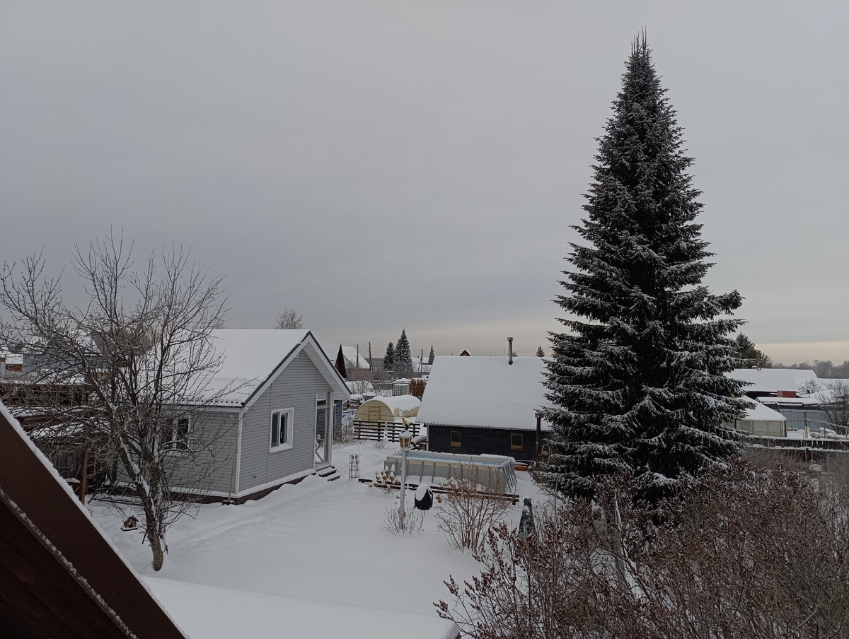 Сначала в деревню. Да, был вторник, а не среда, но ехать куда-то 31-го очень уж не хотелось. Всю дорогу мела сильная позёмка, и снегу в ограде опять навалило. Но расчищать его я не стала - прорубила только дорожку от ворот до крыльца и всё. Некогда было. Обиходила кота, а потом по сугробам полезла к лестнице на мансарду. Ура, я оказалась права, гирлянды и игрушки оказались там, в кладовке! Так что гирляндовый вор был полностью оправдан, а я рада, что, всё же, вспомнила и обрела свои домики и сосульки. Сфоткала участок сверху. Обратила внимание на то, как мало этой зимой солнечных дней