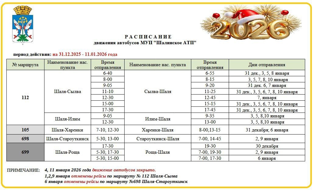 🚌 4 и 11 января автобусы не будут ходить вообще! ❗️Также есть точечные отмены на популярных направлениях: 🔹 Маршрут № 112 (Шаля – Сылва – Шаля) не будет работать 1, 2 и 9 января. 🔹 Маршрут № 698 (Шаля – Староуткинск – Шаля) отменен 6 января. 👀 В остальные дни автобусы будут ходить по измененному расписанию! Планируйте поездки заранее и уточняйте точное время в расписании ниже. Источник: Администрация Шалинского МО 📨 Присылайте свои новости в наш бот – @mbnews_bot @nasha_shalya 3️⃣3️⃣
