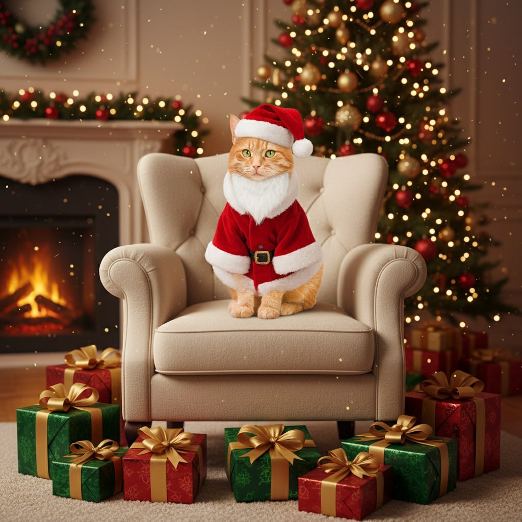 🔥 Делаем из своего кота или пса звезду праздничного стола. Закидываешь фото любимца в @SnapToVideo_bot, выставляешь сходство на максимум и получаешь готовую открытку. ⚡️ Используя загруженное фото питомца в качестве точного эталона внешности, сохранив 100-процентное сходство породы, окраса и черт мордочки, создайте фотографию по описанию. Фотореалистичный [портрет в полный рост] питомца, на котором изображен [кот/пес]. Питомец одет в детально проработанный [красно-белый костюм Санта-Клауса с белой меховой оторочкой и маленьким колпаком на голове]. Питомец [элегантно сидит] в [уютной гостиной с праздничным декором], вокруг лежат [красиво упакованные коробки с подарками и золотыми лентами]. На фоне — наряженная [высокая елка] с теплыми мерцающими гирляндами. В воздухе [летают искры золотого конфетти]. У питомца [внимательный и добрый взгляд] прямо в объектив. [Мягкое вечернее освещение от камина и гирлянд]. Высокая детализация шерсти, 8k, кинематографичный стиль. Как менять: 👀 🎯 В