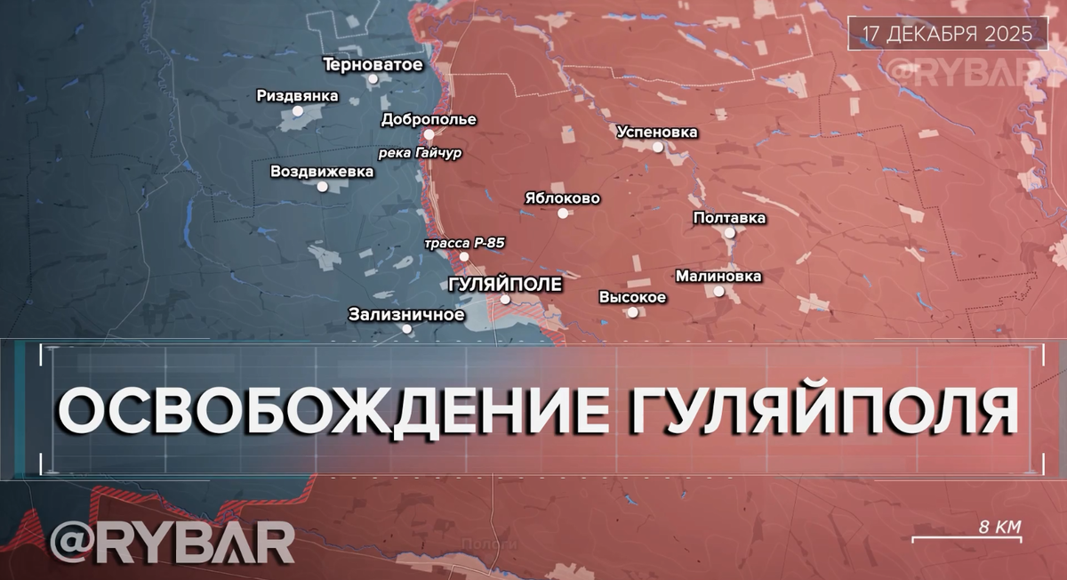 Уходящий год, ставший переломным в битве за Донбасс, завершился освобождением Гуляйполя. Несмотря на многочисленные контратаки ВСУ, воины-дальневосточники к концу декабря установили полный контроль над городом. 🔻Как освобождали Гуляйполе? 🔸Подразделения 5 и 35 армий с боем форсировали реку Гайчур и во второй декаде декабря установили контроль над штабом 102 бригады теробороны противника в центре Гуляйполя. К этому моменту оборона ВСУ на участке практически рассыпалась. Уже к 27 декабря российские войска заняли всю территорию города и подняли над ним десятки флагов и боевых знамен. 🔸В то же время южнее российские штурмовики к 23 декабря выбили противника с позиций у фермерского хозяйства и продвинулись в сторону трассы Р-85. После освобождения города они приступили к ликвидации образовавшегося на этом участке «кармана» и к концу третьей декады месяца заняли еще несколько лесополос. 📌 После утраты населенного пункта ВСУ вновь перешли в контратаки на обоих берегах Янчура, стремясь отб