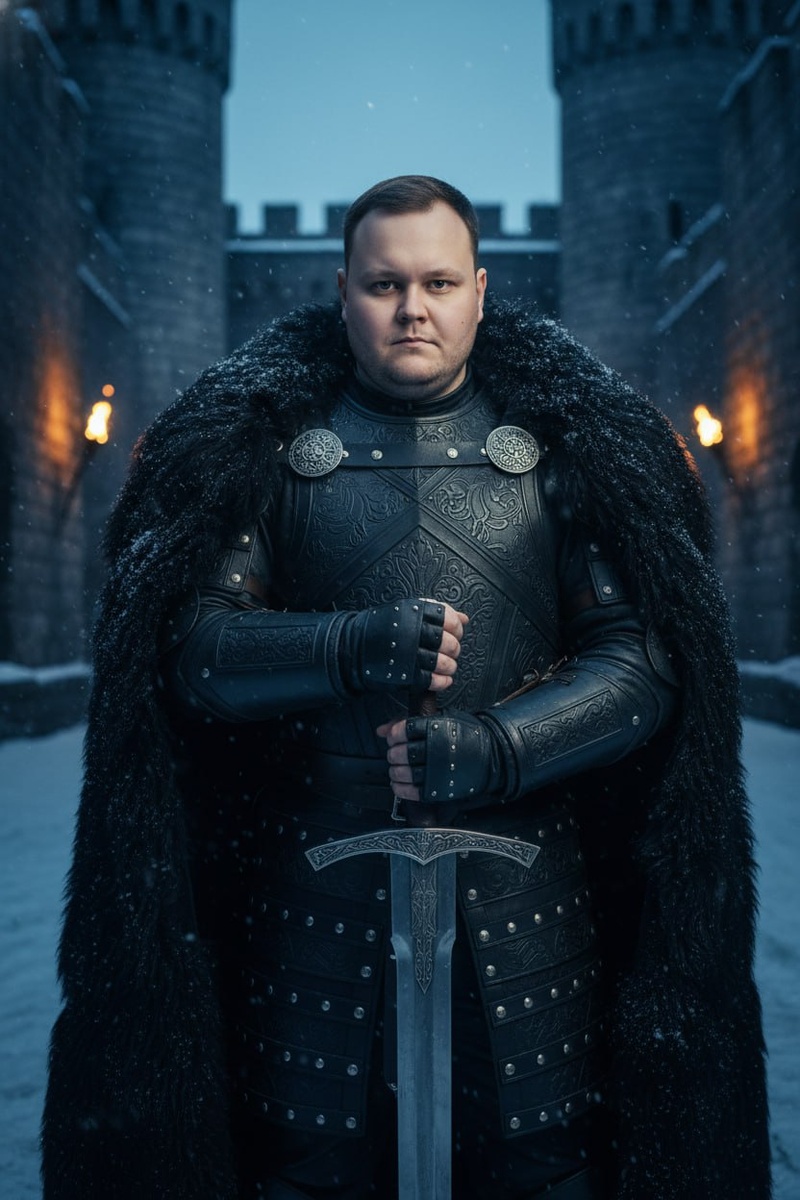 🔥 Убираем все отсылки к кино, оставляем чистую мощь, сталь и мех. Этот промпт сделает из тебя сурового правителя северных земель без лишних вопросов. Только кожа, тяжёлые доспехи и ледяной взгляд. Закидываем селфи в бот @SnapToVideo_bot и забираем свой трон. ⚡️ Используя загруженное селфи как точный референс лица с полным сохранением всех черт и идентичности на 100%, создай фотографию по описанию, сохраняя абсолютное сходство лица. Суровый и величественный кинематографичный [портрет по пояс] мужчины в стиле эпического тёмного фэнтези. Он [стоит неподвижно, глядя прямо в камеру с решительным и властным выражением лица]. Одет в [тяжёлый чёрный кожаный доспех с рельефными узорами и стальными пластинами, поверх которого накинут массивный плащ из густого тёмного меха с серебряными застёжками]. В руках [держит рукоять массивного двуручного меча из гравированной стали]. Локация: [двор древней каменной крепости в зимних сумерках, на фоне видны высокие башни и горящие факелы]. [Холодное есте