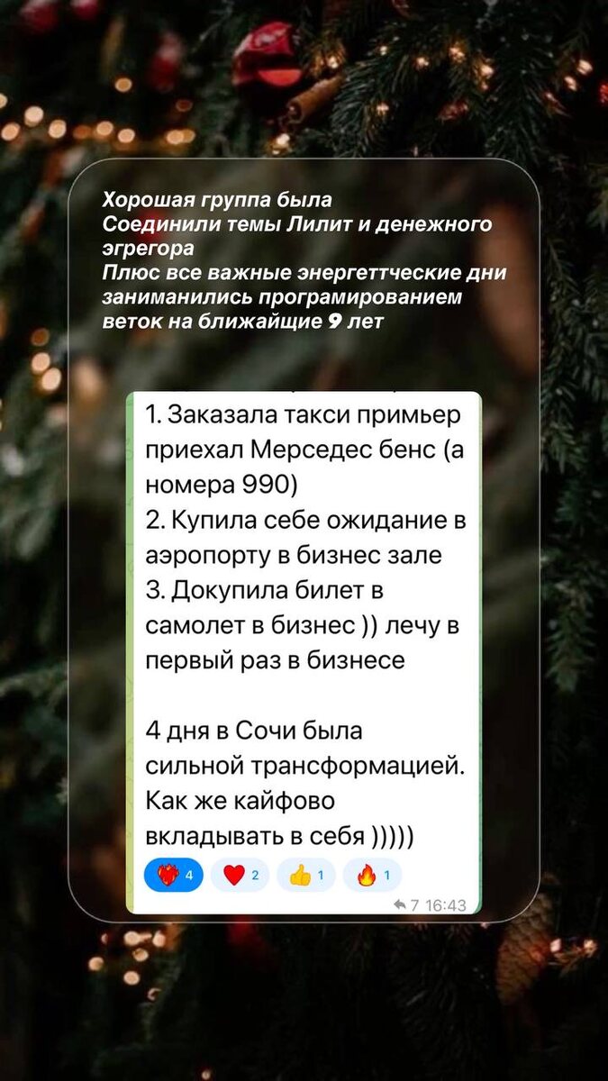 » В работу была добавлена тема Денежного Эгрегора( раскачка денежного канала) Энергии Лилит Работа со второй чакрой Сборка двух полярностей Работа с внутренним мужчиной Тема близнецовых пламен Всё это усилили раскачкой денежного канала и всё эти мощные дни , когда шла закладка будущих 9ти лет мы прошивали новые коды , чистили внутренние пространство , сжигали вирусные программы. Каждый с того уровня, на котором находится. В придачу выдала ну очень мощную практику прочищающую , активирующую и балансирующую 2,3,4,5 каналы. ( процесс творения материи происходит в них) Процесс творения стал более осознанным, усилился новыми кодами . Распаковки начались . Идти будут в течении года . Главное, что самое продуктивное время за последние 9 лет мы не проебали и использовали продуктивно . Старые версии горят , само ценность повышается, возврат в центр себя продолжается. Идем дальше. Работа не заканчивается В январе тоже ждут энергетические порталы проводящие потоки . А вместе с