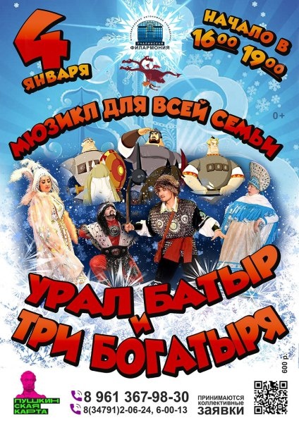 Нас снова ждет встреча с героями мюзикла для всей семьи «Урал Батыр и три богатыря» В ярком и фееричном представлении на одной сцене сойдутся и русские богатыри и легендарный Урал Батыр. Героям придется пройти через множество испытаний, которые можно одолеть лишь силой дружбы! Злой царь Азрака похитил Деда Мороза со Снегурочкой и красавицу Хумай возлюбленную Урал Батыра. Кто поможет одержать победу над злом и спасти праздник? Вас ждет масштабное шоу, в котором каждая песня хит, каждый номер потрясение! Огромные экраны перенесут вас в сказочные миры! Десятки актеров и танцовщиков,- они вернут вам веру в настоящие чудеса! Спешите увидеть необыкновенные и фантастические приключения Урал-Батыра и трех богатырей! Вас ждут замечательные песни и танцы, яркие костюмы и море радостных эмоций! __________ Нач. 16:00, 18:00 Билеты в продаже онлайн и в кассе филармонии, цена 600 р. Касса работает в будние дни с 10:00 до… https://uchaly102.ru/?p=118490