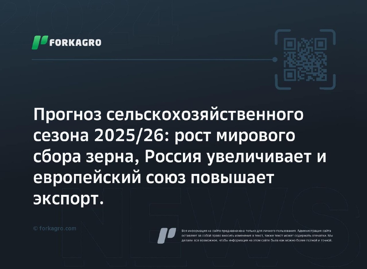 Прогноз сельскохозяйственного сезона 2025/26: рост мирового сбора зерна, Россия увеличивает и европейский союз повышает экспорт