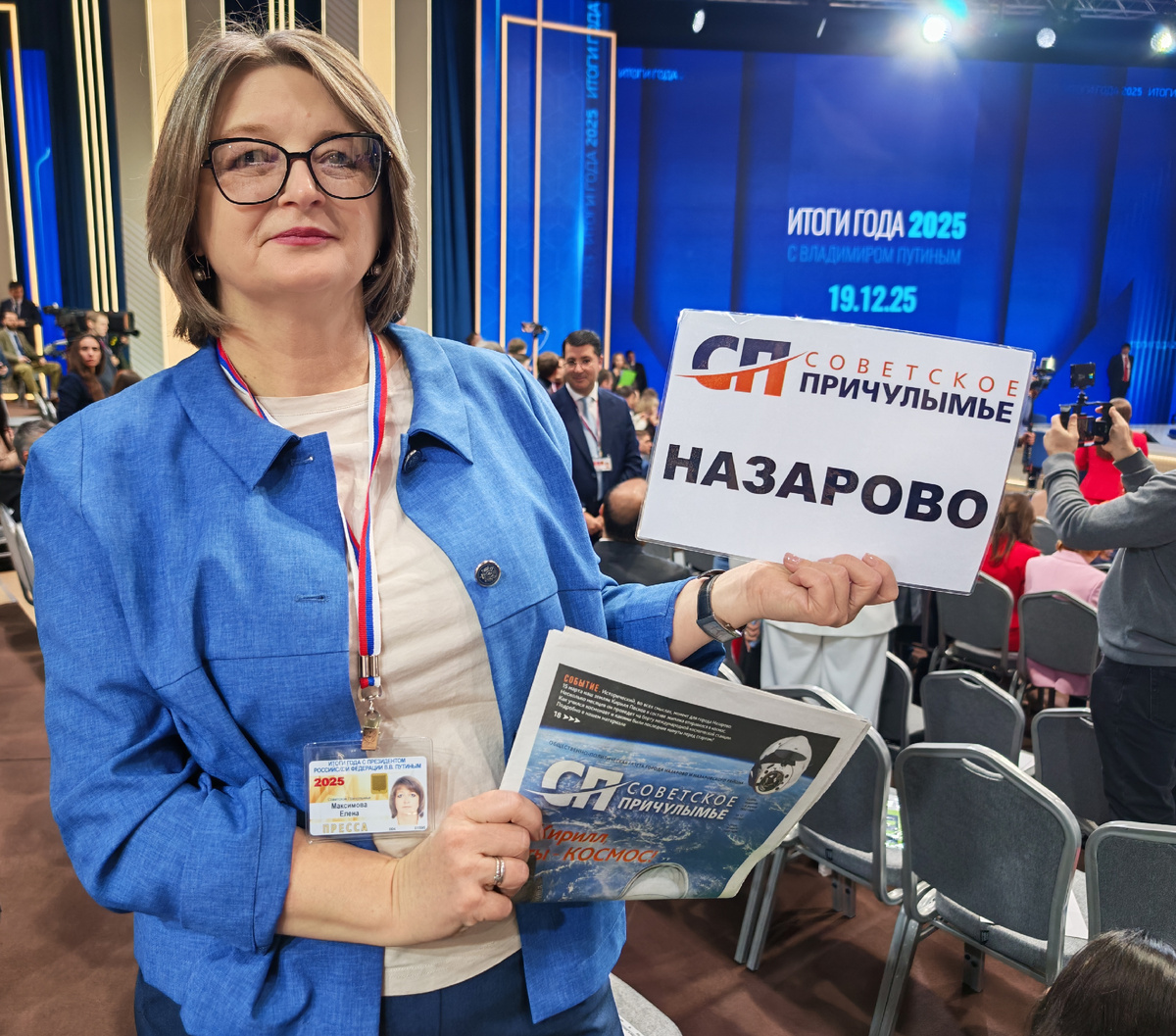 Владимир Путин отвечал на вопросы 4,5 часа, отвечал без промедления, живо, бодро, без каких-либо подсказок. И это впечатляло не только российских, но и зарубежных журналистов. К сожалению, озвучить свой вопрос так и не получилось. Но «засветить» территорию все же удалось. Поняла это в первые же минуты конференции. На телефон стали поступать вопросы земляков и фотографии трансляции. Это и правда удивительно ощущение- видеть название своего города на всех экранах страны. Заметна была и наша табличка с названием газеты и надписью Назарово, и сама газета, выпуск которой был со мной. Все составленные вопросы передали в работу.