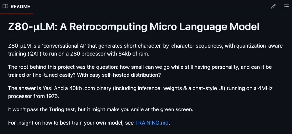 😮 Пока OpenAI оставляют нас без доступных видеокарт и оперативки, энтузиаст доказал, что для этих ваших ИИ достаточно и 4 МГц 😂 Он создал языковую модель, которая умудряется работать на легендарном 8-битном чипе Z80 (да-да, том самом, что стоял в ZX Spectrum). Как это вообще возможно: — Экстремальное сжатие: веса модели квантованы до 2 бит (значения только -2, -1, 0, +1); — Никаких чисел c плавающей точкой. Вся математика переписана на целочисленную, понятную старому процессору; — Весь «мозг» вместе с чат-интерфейсом весит смешные 40 КБ и запускается из-под CP/M. Работает схема так: тренируете модель с комфортом на Python, экспортируете .COM файл, заливаете на ретро-ПК и наслаждаетесь беседой с зеленым экраном. Тест Тьюринга врядли пройдет, но для вау-эффекта этого более чем достаточно 😂 Сдуваем пыль со своих железок 😁